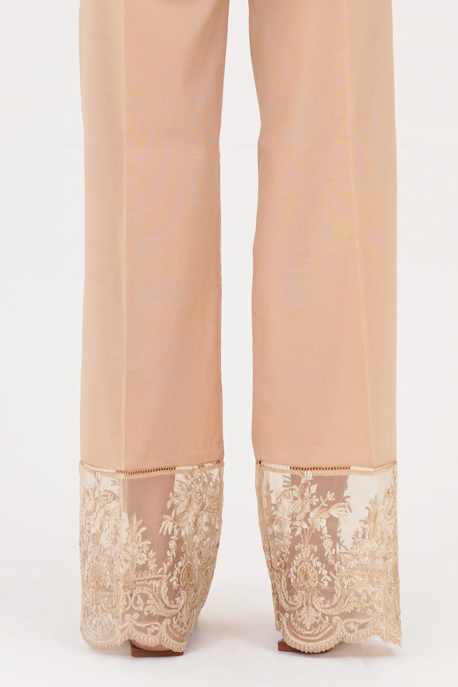 A traditional composition is portrayed on these elegant cambric trousers rendered in a classic neutral shade. Enriched with intricately embroidered organza patch, these classy bottoms are a perfect option to look sophisticated this season. Available in 2 colors.