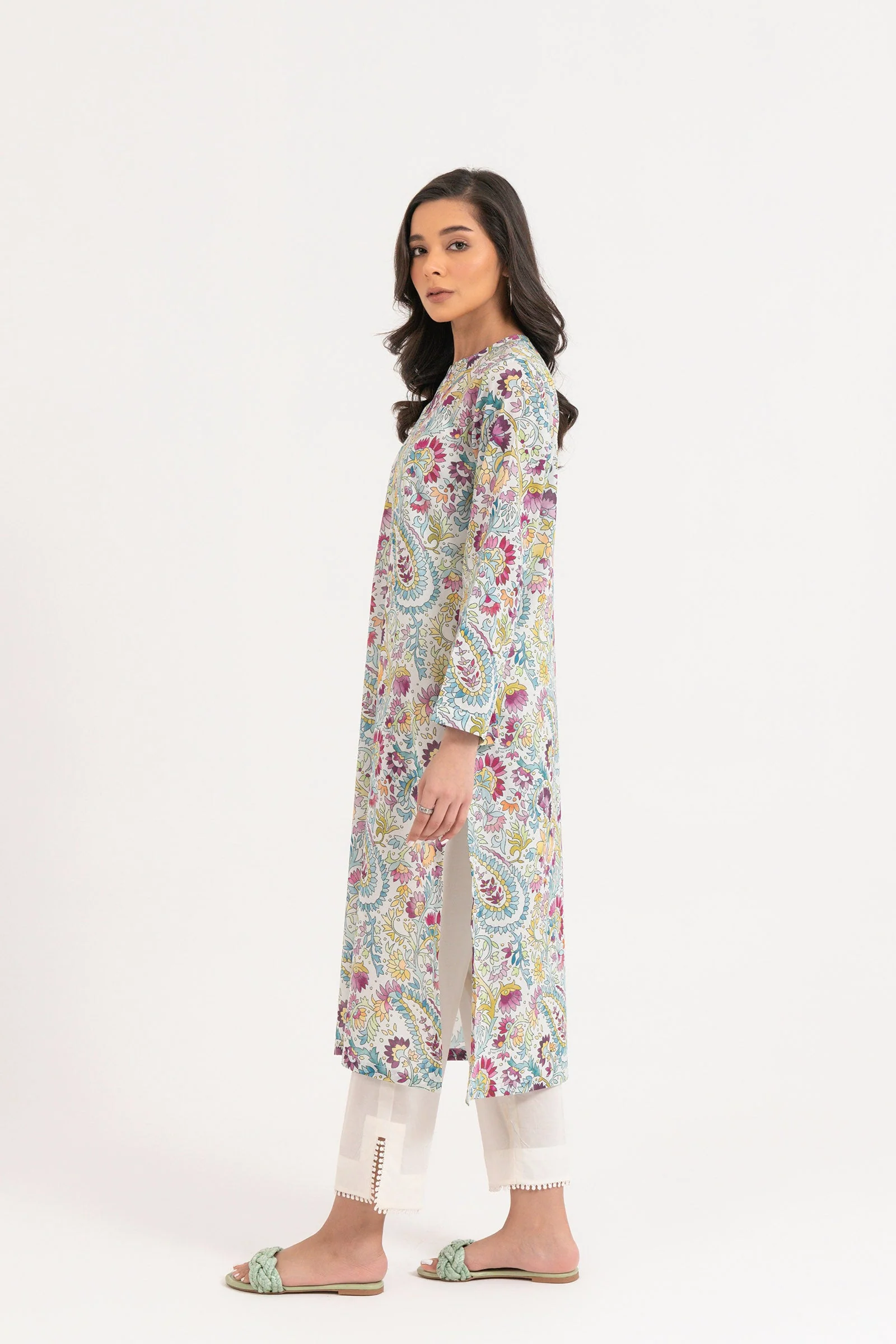 This beautiful outfit features a mesmerizing composition layered on a multi-hued lawn canvas. Rendered in a traditional shirt silhouette enhanced with beautiful floral digital print all over, this design will be an ideal addition to your summer closet.