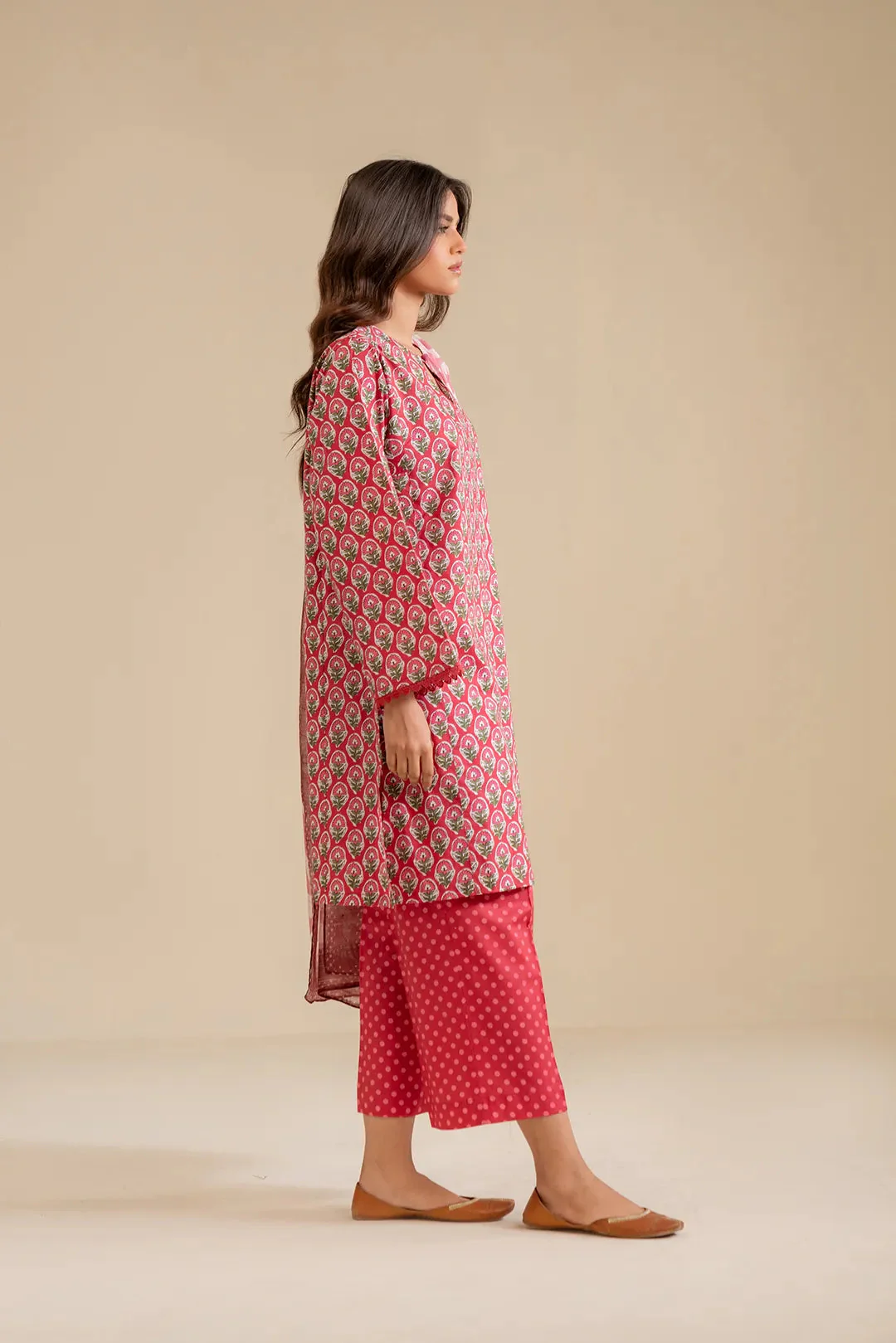 This stylish three piece suit in lawn fabric features a rich maroon and pink floral print, enhanced by a keyhole neckline for a modern touch. The straight-cut kurta is paired with polka dot-printed trousers, creating a chic contrast. Completing the look is a soft monark fabric dupatta, adorned with an elegant abstract print, adding a graceful flow to the ensemble. Perfect for casual wear.