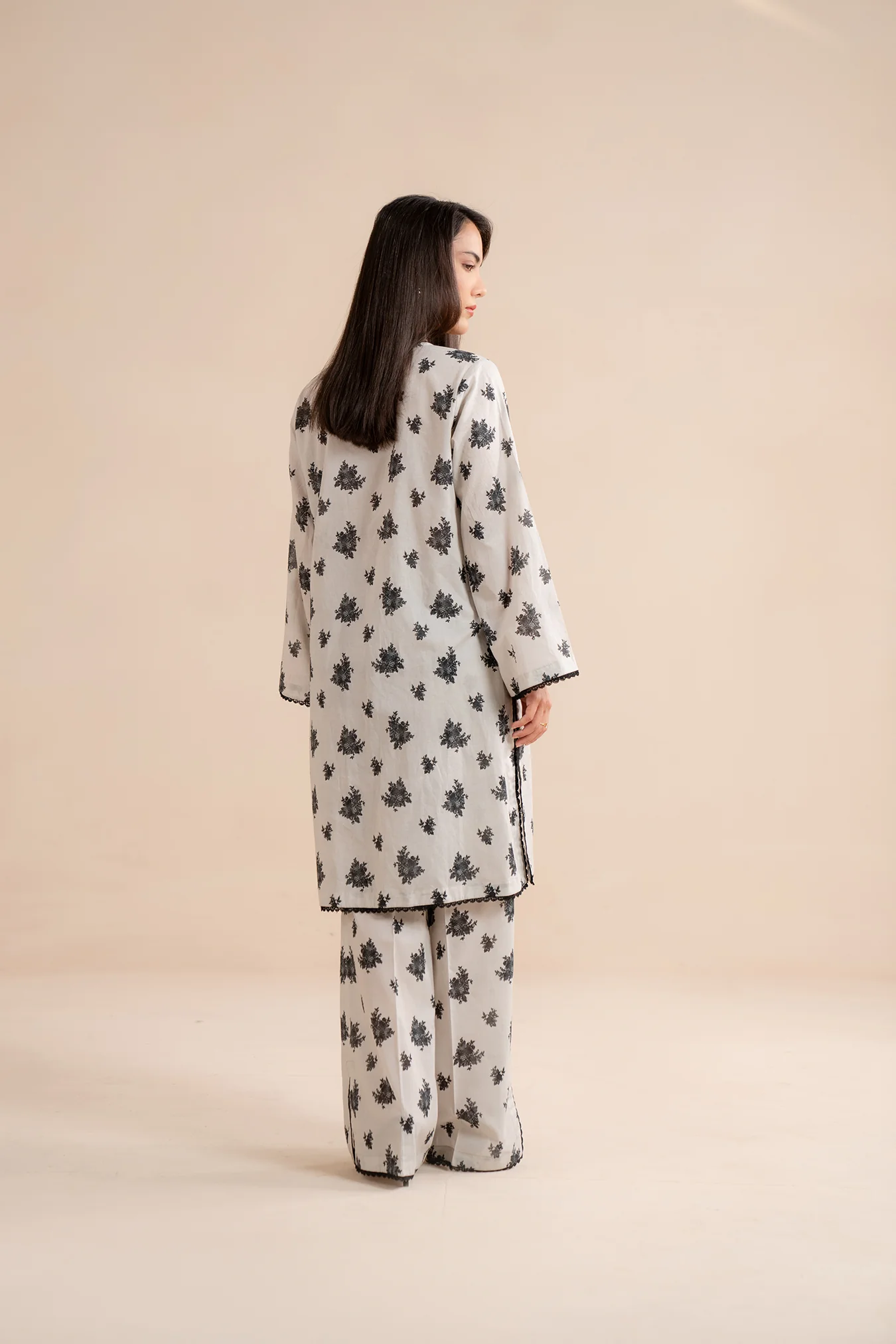 This elegant two-piece set in lawn fabric features a printed kurta with relaxed fit, paired with matching wide-leg trousers.