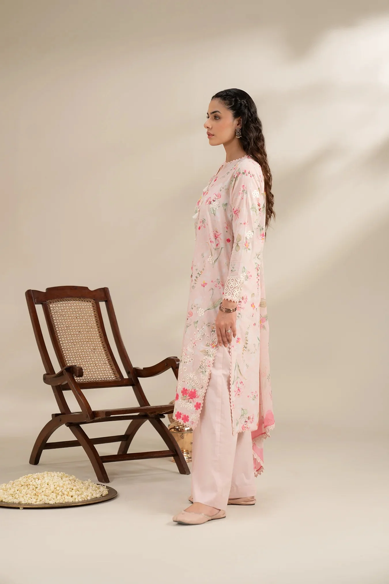 A breezy printed lawn 3-piece suit adorned with delicate floral embroidery on the shirt, paired with an embroidered patch and a dyed lawn trouser.