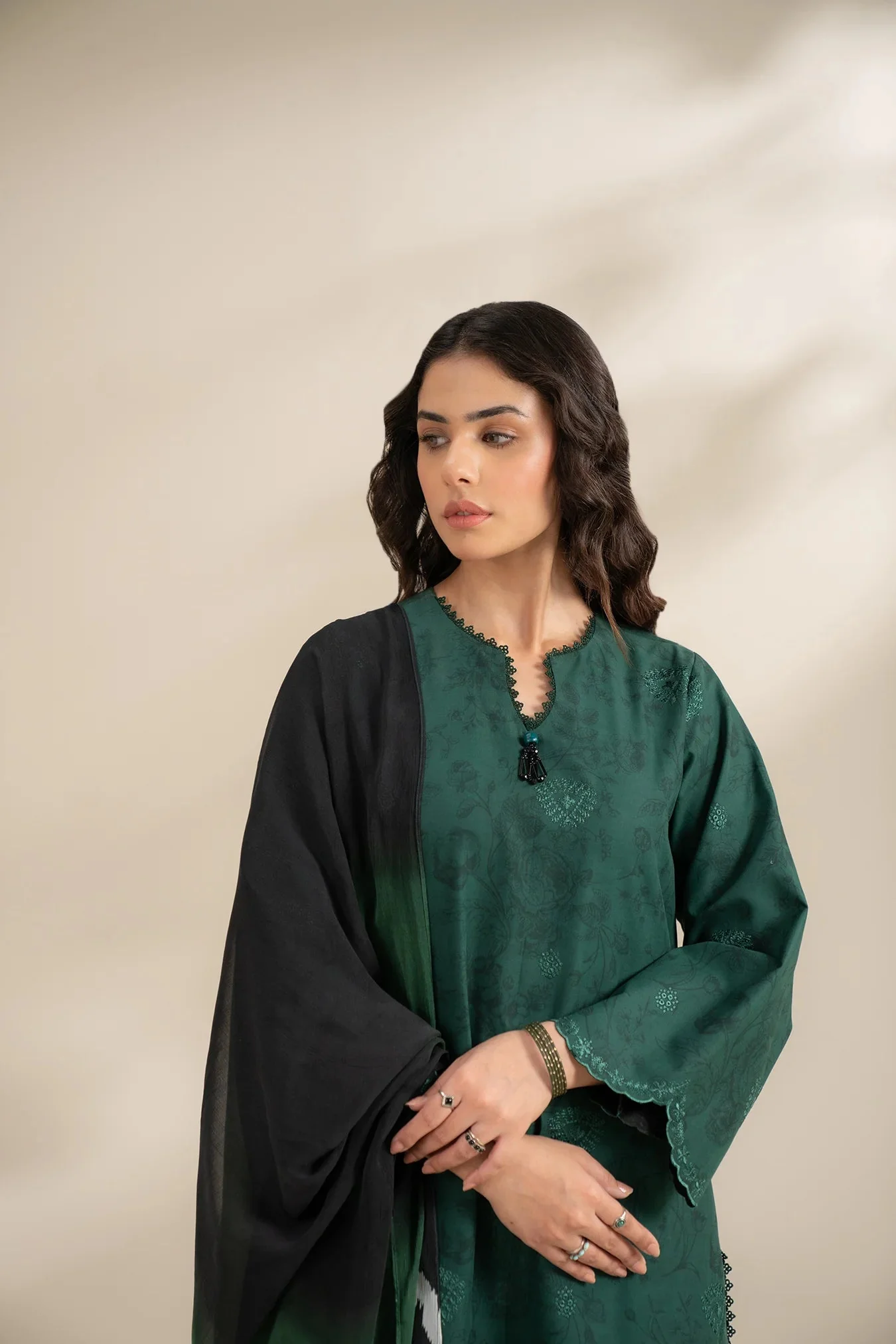 Comes with a printed chiffon dupatta and a dyed trouser, creating a timeless traditional ensemble.